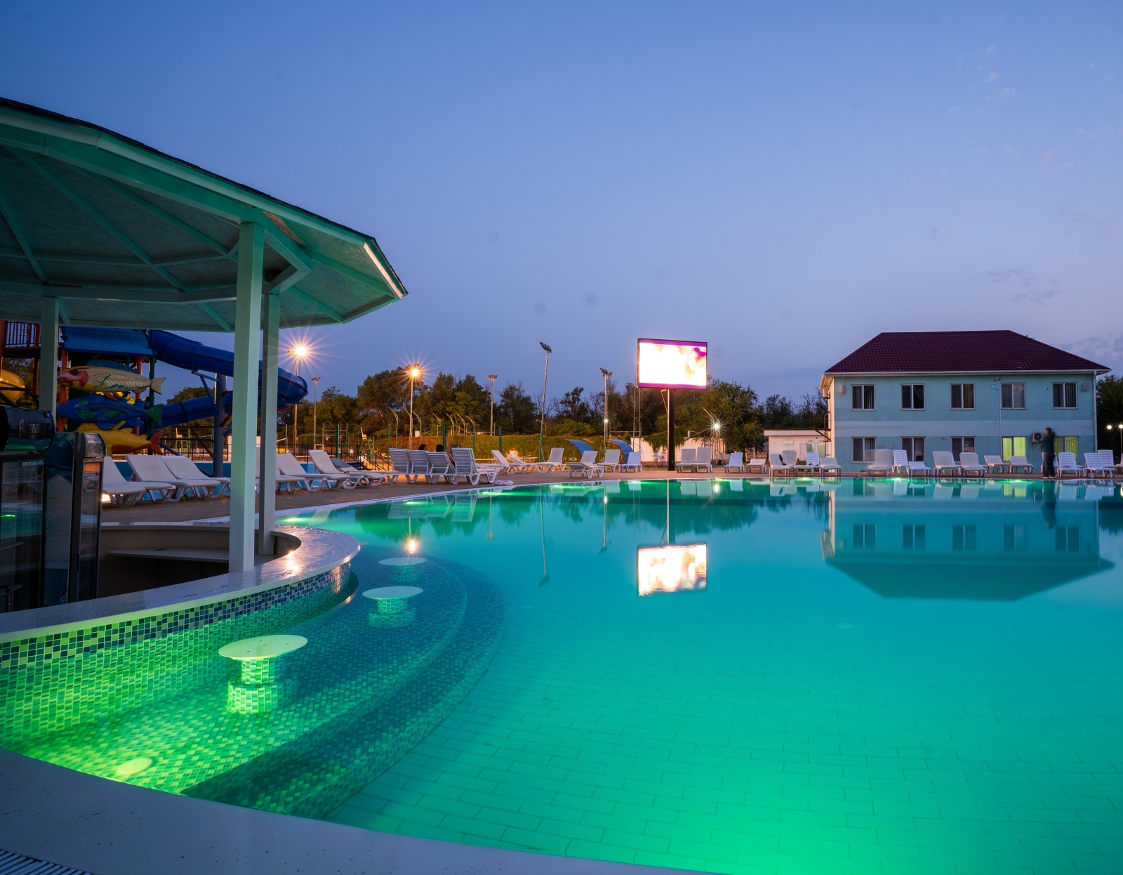 - Открытый большой бассейн с подогревом воды с двумя горками для детей и взрослых