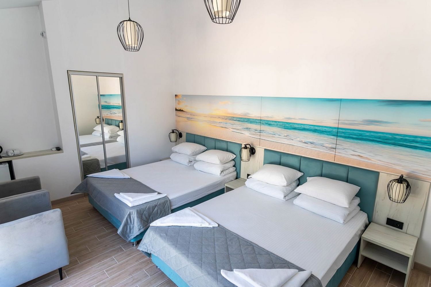 Всего в 450 метрах находится песчаный пляж. На побережье есть все необходимое для хорошего пляжного отдыха — раздевалки, душевые, лежаки, навесы, работает прокат шезлонгов и другого инвентаря.