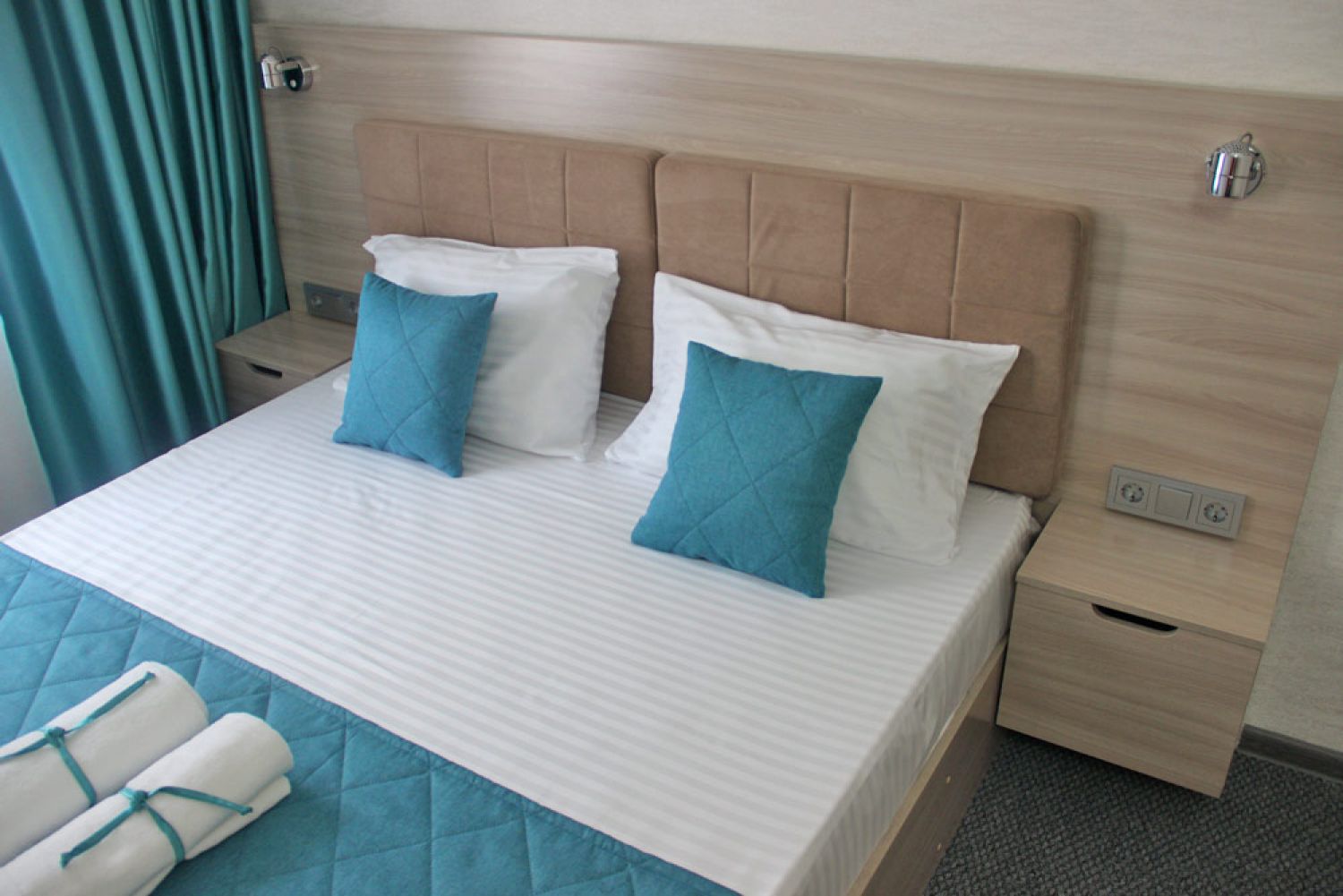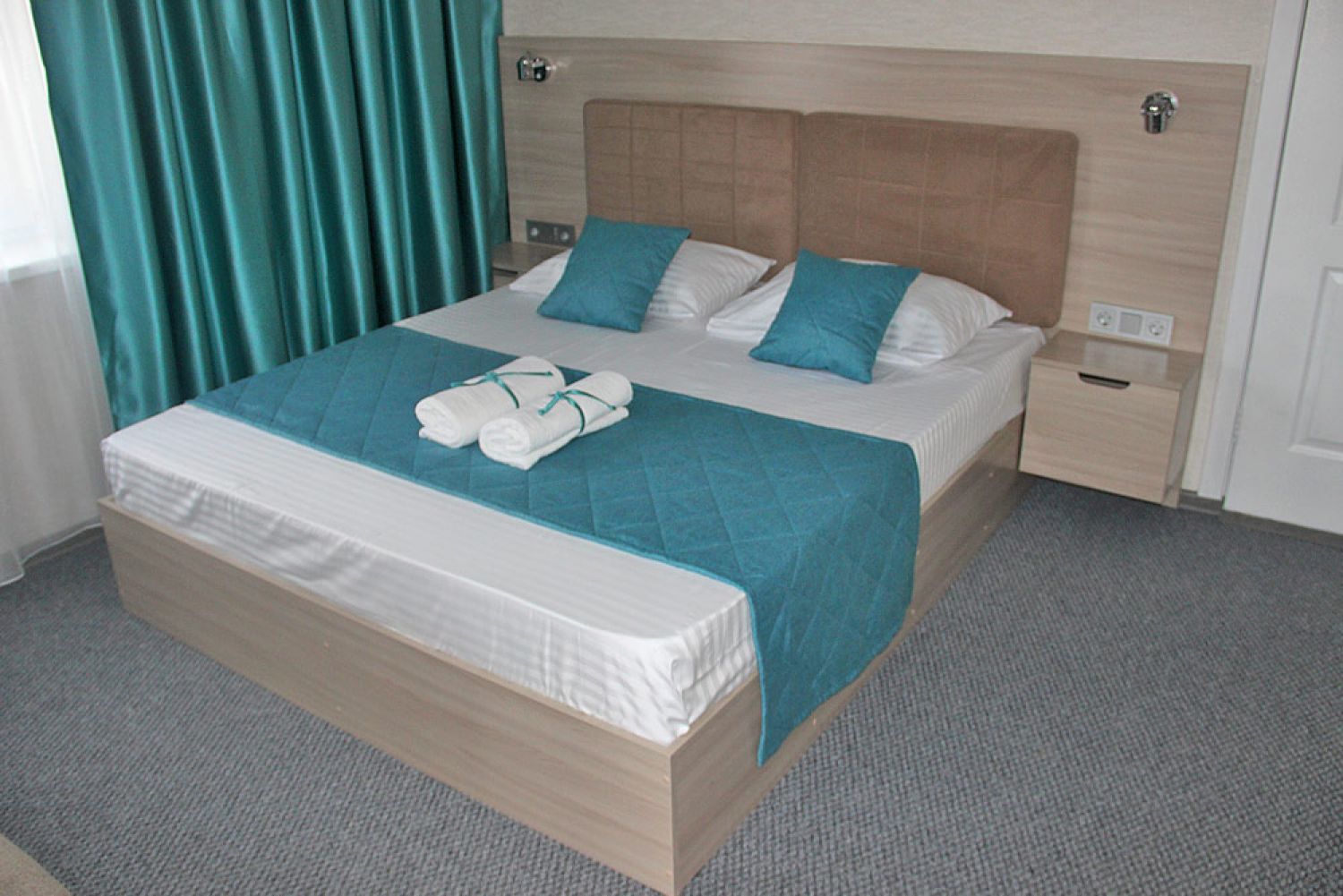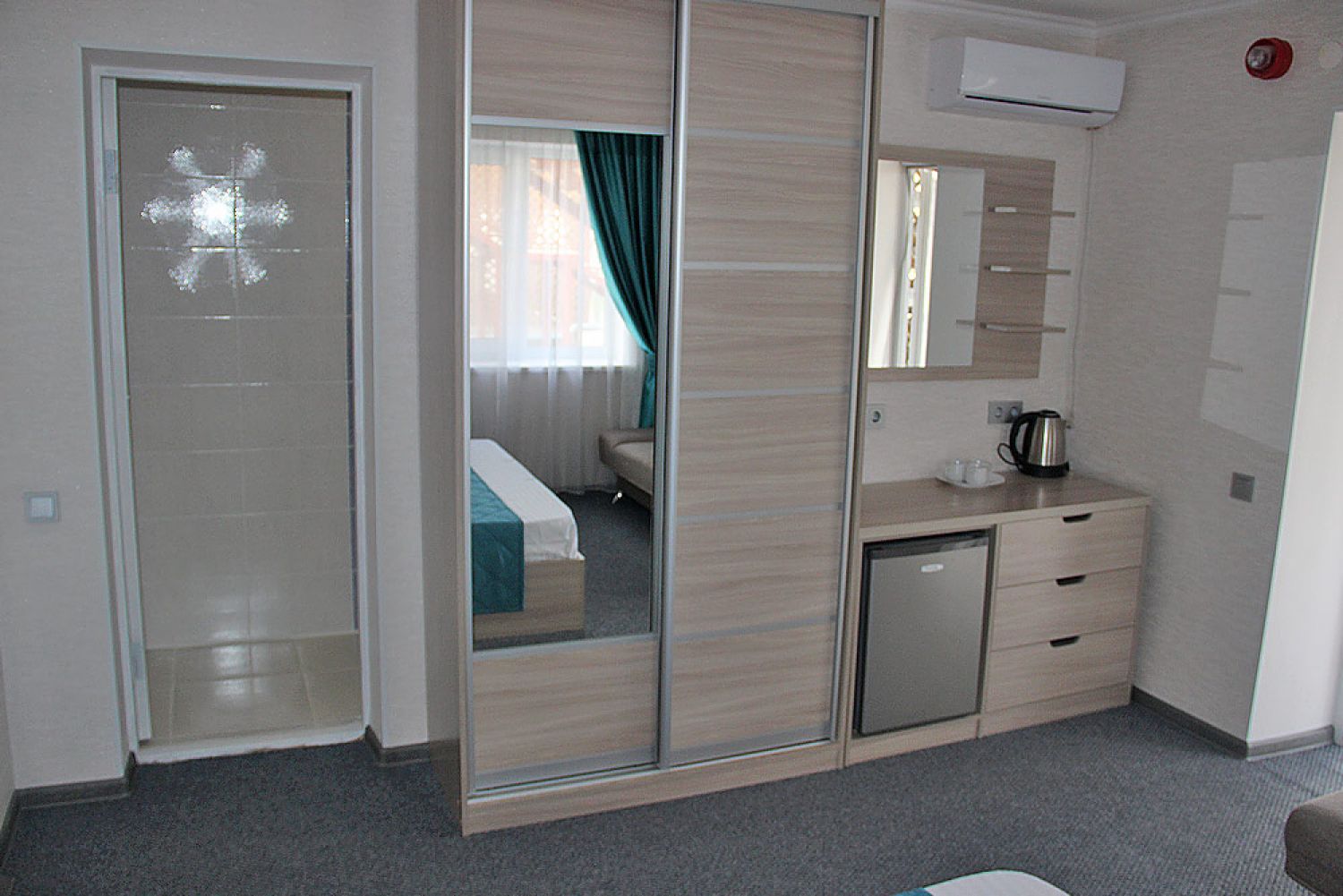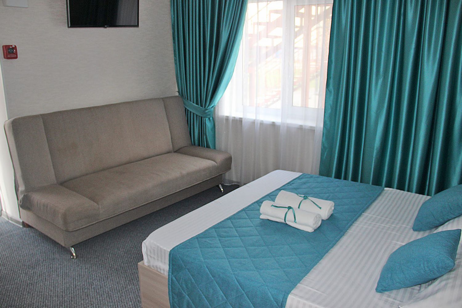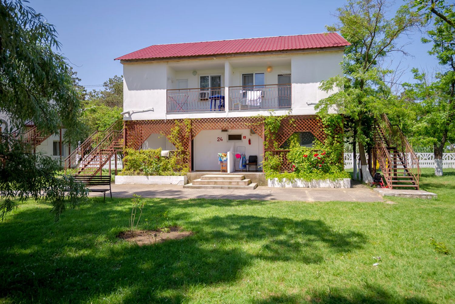 Вместимость: до 5 человек; Преимущества: Авторский дизайн номера, Сейф с кодовым замком, Плазменный телевизор, Две комнаты, Веранда, 1 этаж; Удобства и услуги: Плазменный телевизор, Кондиционер, Шкаф, Душ, Белье, Полотенца, Кровати с ортопедическими матрасами, Чайник электрический, Набор чайной посуды и чайник, Фен, Холодильник, Сейф с кодовым замком, Зеркало, Уборка номеров, WiFi