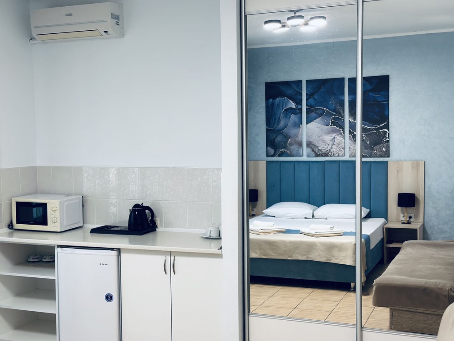 Вместимость: до 6 человек; Преимущества: Сейф с кодовым замком, Плазменный телевизор, Две комнаты, Веранда, Кухонная зона с печью СВЧ, 1 этаж, Месторасположение; Удобства и услуги: Плазменный телевизор, Кондиционер, Шкаф, Душ, Белье, Полотенца, Диван, Тахта, Кровати с ортопедическими матрасами, Чайник электрический, Набор чайной посуды и чайник, Фен, Холодильник, Сейф с кодовым замком, Зеркало, Уборка номеров, WiFi