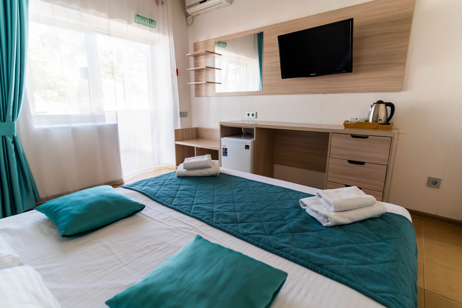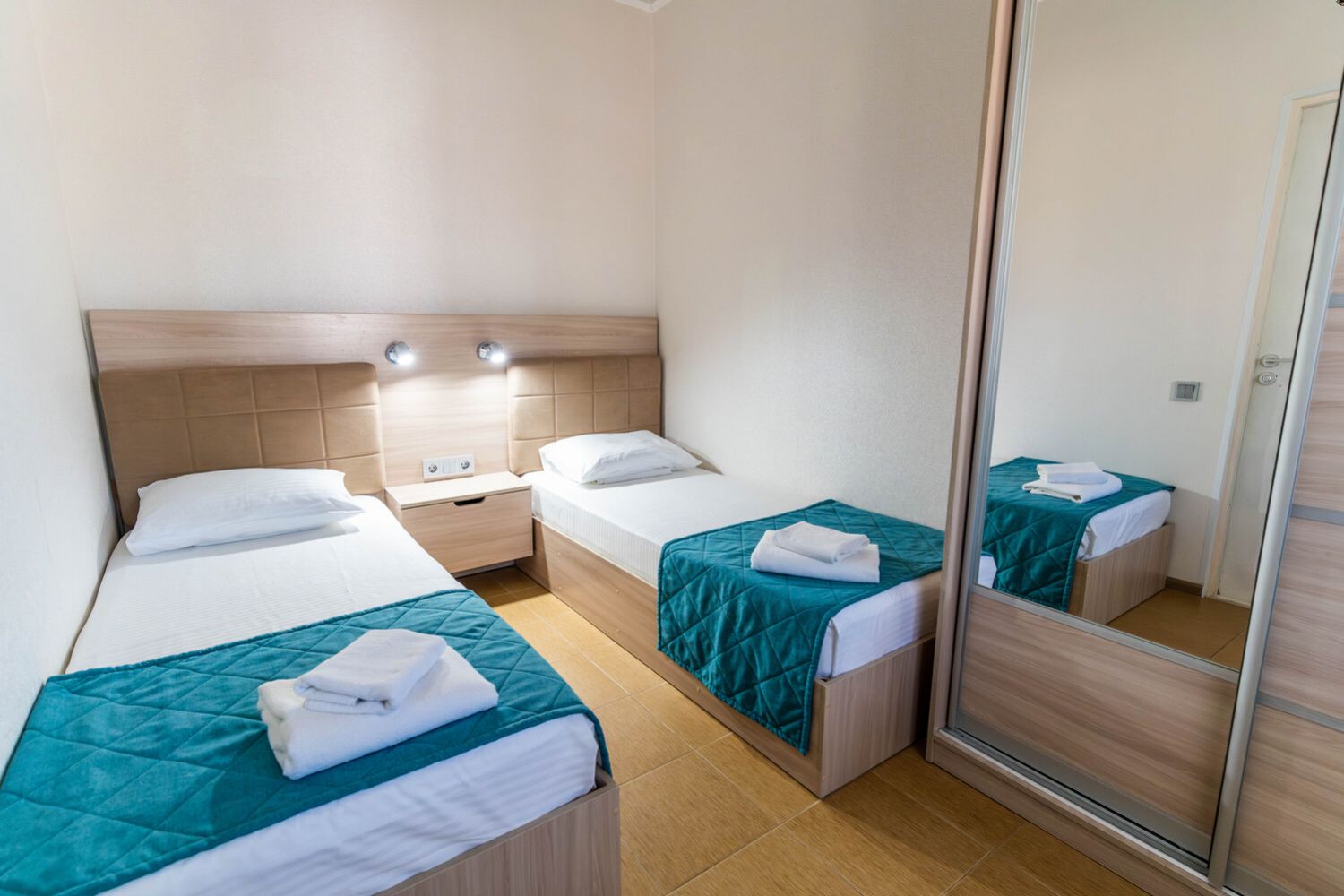 Вместимость: до 4 человек; Преимущества: Авторский дизайн номера, Сейф с кодовым замком, Плазменный телевизор, Две комнаты, Веранда, 1 этаж; Удобства и услуги: Плазменный телевизор, Кондиционер, Шкаф, Душ, Белье, Полотенца, Кровати с ортопедическими матрасами, Чайник электрический, Набор чайной посуды и чайник, Холодильник, Сейф с кодовым замком, Зеркало, Уборка номеров, WiFi